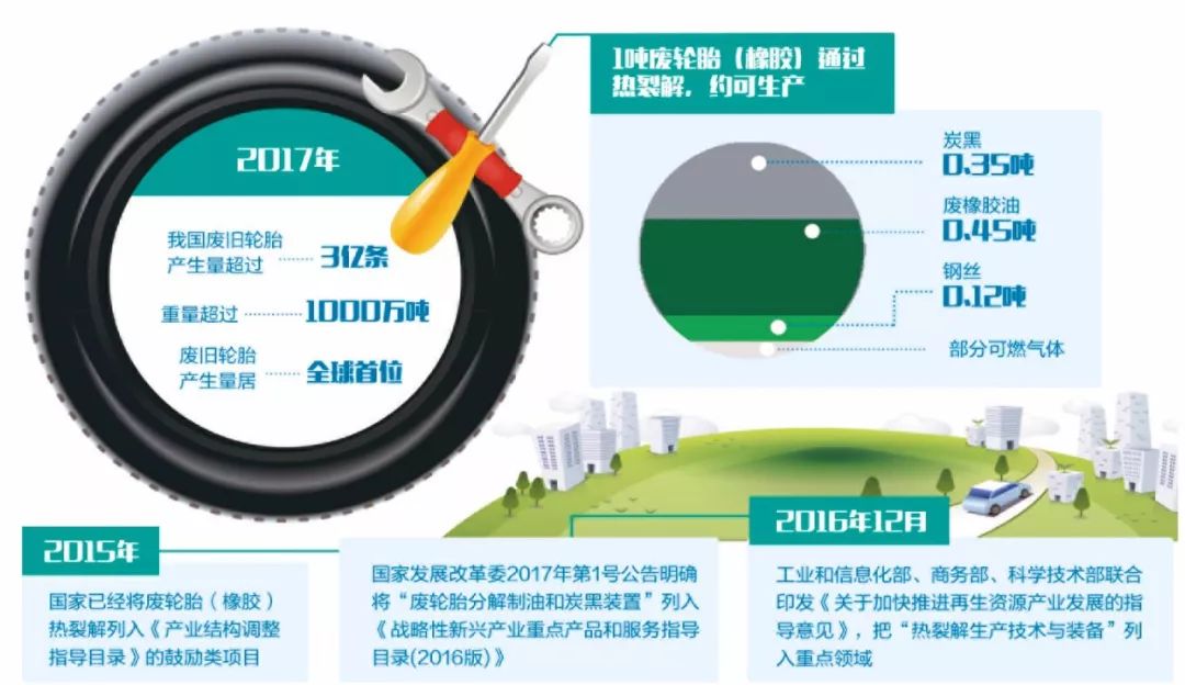 2015年,國家已經(jīng)將廢輪胎(橡膠)熱裂解列入《產(chǎn)業(yè)結(jié)構(gòu)調(diào)整指導(dǎo)目錄》的鼓勵(lì)類項(xiàng)目。國家發(fā)展改革委2017年第1號(hào)公告明確將“廢輪胎分解制油和炭黑裝置”列入《戰(zhàn)略性新興產(chǎn)業(yè)重點(diǎn)產(chǎn)品和服務(wù)指導(dǎo)目錄(2016版)》,2016年12月份,工業(yè)和信息化部、商務(wù)部、科學(xué)技術(shù)部聯(lián)合印發(fā)《關(guān)于加快推進(jìn)再生資源產(chǎn)業(yè)發(fā)展的指導(dǎo)意見》,把“熱裂解生產(chǎn)技術(shù)與裝備”列入重點(diǎn)領(lǐng)域。