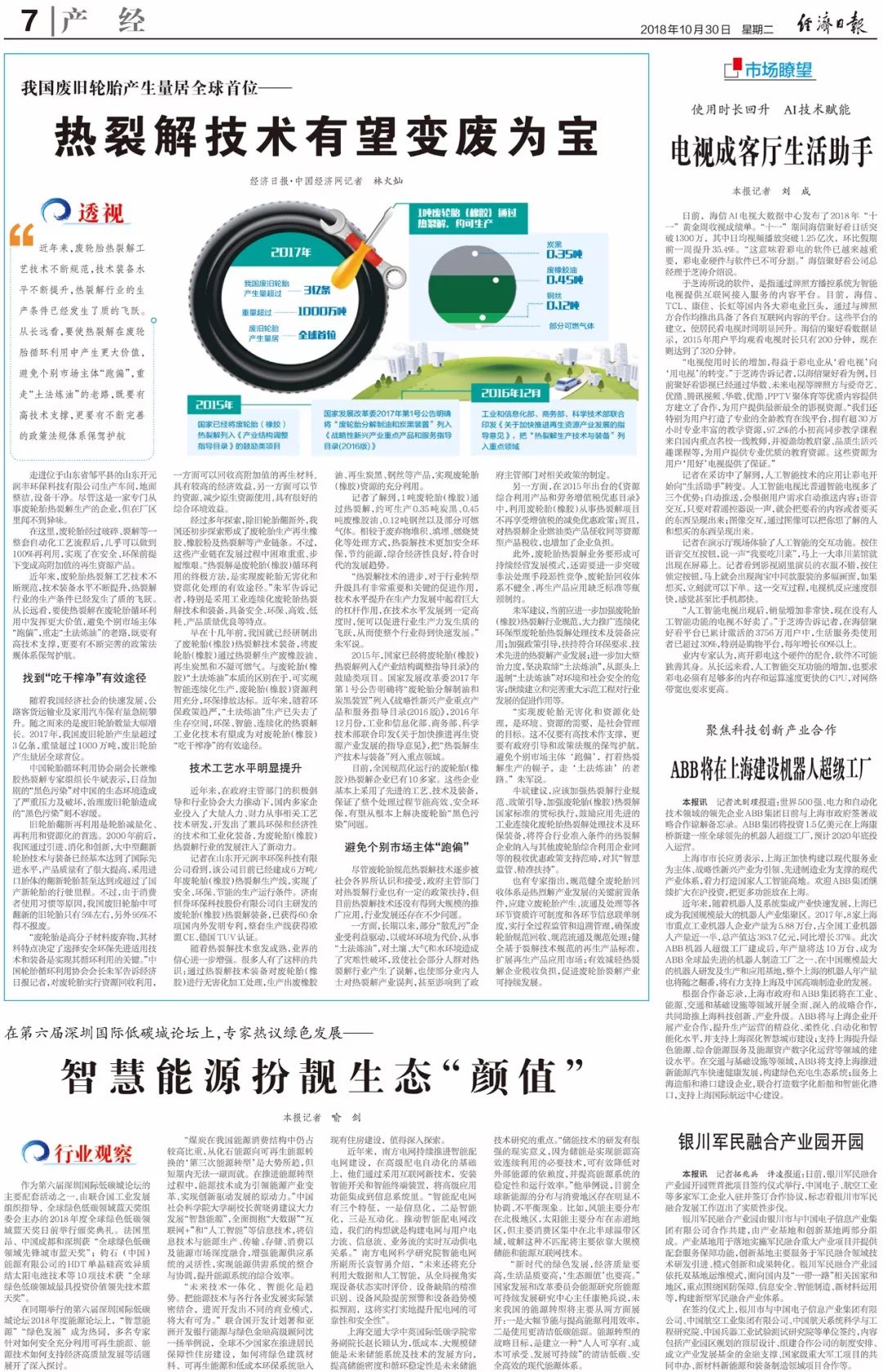近日,《經(jīng)濟(jì)日報(bào)》 、《中國經(jīng)濟(jì)網(wǎng)》主任記者林火燦采訪了中國輪胎循環(huán)利用協(xié)會(huì)會(huì)長朱軍以及中國輪胎循環(huán)利用協(xié)會(huì)副會(huì)長兼橡膠熱裂解專家組組長、濟(jì)南恒譽(yù)環(huán)??萍脊煞萦邢薰径麻L牛斌及行業(yè)相關(guān)專業(yè)人士,并參觀了采用濟(jì)南恒譽(yù)環(huán)保技術(shù)裝備,入選工信部《廢輪胎綜合利用行業(yè)準(zhǔn)入條件》的廢輪胎熱裂解項(xiàng)目,就廢輪胎污染、循環(huán)再生利用技術(shù)、熱裂解行業(yè)發(fā)展前景及相關(guān)政策等問題與各位專家進(jìn)行了深入交流。并依據(jù)采訪內(nèi)容撰寫題為《我國廢舊輪胎產(chǎn)生量居全球首位——熱裂解技術(shù)有望變廢為寶》的文章,刊登于《經(jīng)濟(jì)日報(bào)》。