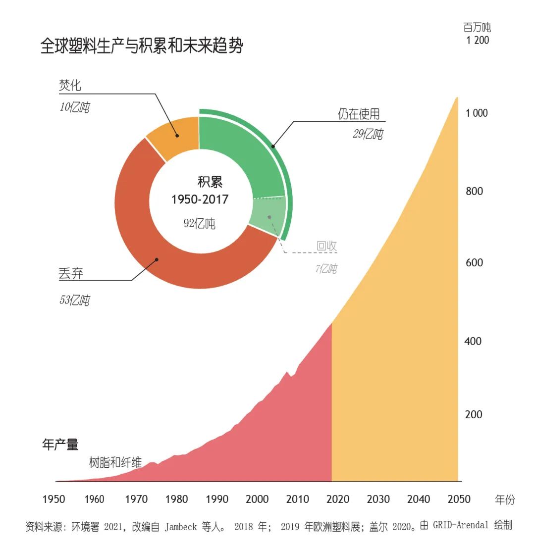 1950-2017期間全球累積產(chǎn)生92億噸廢塑料;其中,其中大約70億噸都成為了塑料垃圾。這些塑料垃圾的回收率很低,不到10%。數(shù)以百萬噸計(jì)的塑料垃圾被丟棄到自然環(huán)境中,或是被運(yùn)到數(shù)千公里之外焚燒或傾倒。