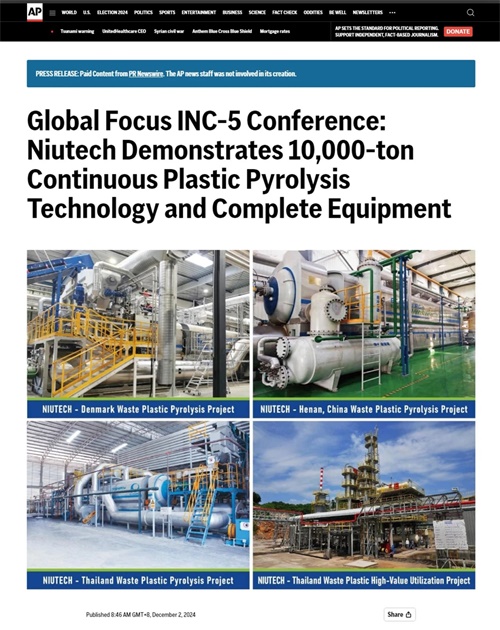 第五屆政府間塑料污染談判委員會(huì)(INC-5)在INC-5會(huì)議期間,美國(guó)最大的通訊社,將關(guān)注重點(diǎn)從會(huì)場(chǎng)內(nèi)轉(zhuǎn)向會(huì)場(chǎng)外,,并以“Niutech Demonstrates 10,000-ton Continuous Plastic Pyrolysis Technology and Complete Equipment”為題,報(bào)道了恒譽(yù)環(huán)保在丹麥、泰國(guó)、韓國(guó)及中國(guó)本土,持續(xù)穩(wěn)定運(yùn)行數(shù)年的多個(gè)。“全球廢塑料污染治理,離不開先進(jìn)技術(shù)的支撐,其中來自中國(guó)的恒譽(yù)環(huán)保,,安全環(huán)保地將廢塑料變?yōu)樵偕Y源產(chǎn)品,減少了環(huán)境污染的同時(shí),為經(jīng)濟(jì)綠色發(fā)展做出貢獻(xiàn),為全球廢塑料污染治理提供了示范案例。