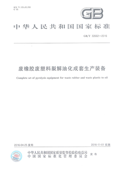 2016年11月1日,公司為第一起草單位的國家標(biāo)準(zhǔn)《廢橡膠廢塑料裂解油化成套生產(chǎn)裝備》標(biāo)準(zhǔn)號:GB/T 32662-2016,正式頒布實施