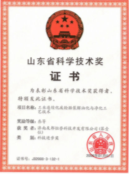 2009年1月7日,公司《工業(yè)連續(xù)化廢輪胎裂解油化與凈化工藝技術(shù)》被授予“山東省科學(xué)技術(shù)獎(jiǎng)(科技進(jìn)步獎(jiǎng))”