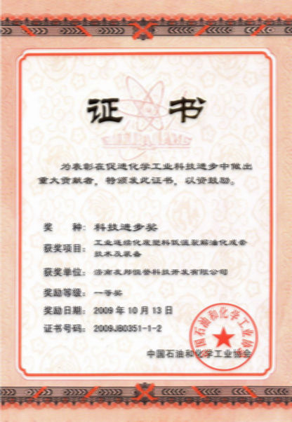 2009年10月13日,公司《工業(yè)連續(xù)化廢塑料低溫裂解油化成套技術(shù)及裝備》項(xiàng)目榮獲中國(guó)石油和化學(xué)工業(yè)協(xié)會(huì)科技進(jìn)步獎(jiǎng)